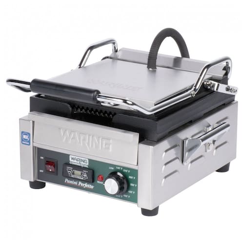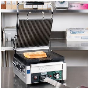 Grelha elétrica profissional com placas ranhuradas superior e inferior. Superfície de cozimento de 25 x 23 cm em ferro fundido opera até 299°C com timer NSF e controle por dial; construção em aço inoxidável. Compatível com alimentos de até 7,6 cm de espessura.Funciona como grill