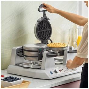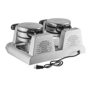 Máquina de waffles belga elétrica dupla com 4 moldes independentes (grid double), projetada para produção de até 120 waffles belgas de 1 polegada (2,5 cm) de espessura por hora. Indicada para cozinhas de alto volume como cafés e buffets continentais, com elementos de aquecimento embutidos e rotação para cozimento uniforme. Estrutura em alumínio fundido pesado para resistência em uso contínuo. Placas triplamente revestidas com antiaderente para remoção e limpeza facilitadas. Controles termostáticos independentes por lado com chaves toggle on/off e sinal sonoro de prontidão e fim de ciclo. Permite preparo simultâneo de massas diferentes. Duas bandejas de gotejamento laváveis em lava-louças para coleta de excesso de massa. Certificação NSF para higiene comercial.Porta-fio