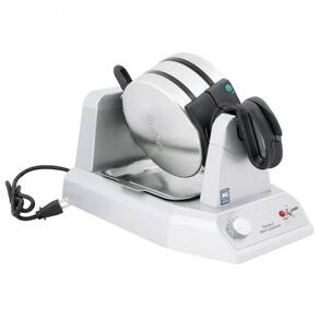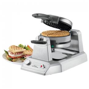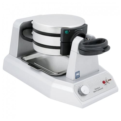 Máquina de waffles dupla para produção contínua, design empilhado, controle termostático, placas triplamente revestidas antiaderentes, certificação NSF, bandeja coletora de gotejamento.Porta-fio