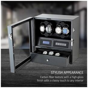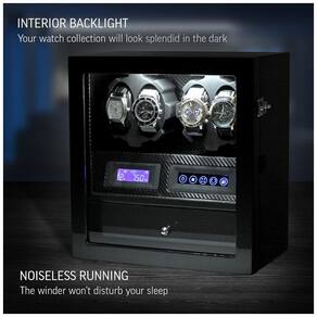 COMPATIBILIDADE UNIVERSAL 2 rotores programados individualmente e 15 programas de corda disponíveis oferecem compatibilidade para todos os modelos de relógio. Você pode definir o número de Turns Per Day de 650 a 1950 TPD. LUZ INTERIOR O movimentador do relógio possui luzes LED integradas. Seus relógios ficarão especialmente bonitos no escuro. FÁCIL DE USAR E CONFIGURAÇÃO Um display LCD mostra todas as informações disponíveis sobre os modos de operação do movimentador de relógio. O controle de toque simplifica o processo de configuração. TODA A SUA COLEÇÃO DENTRO 4 slots para enrolador de relógios e 5 compartimentos de zenamento de relógios proporcionam máxima usabilidade em um tamanho compacto. O DOOR LOCK permite impedir o acesso indesejado Marca: Não Informado