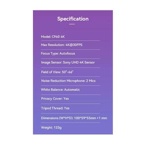 Webcam emeet c960 4k kit para pc, sensor cmos 4k uhd, foco automático, microfones ai duplos com supressão de ruído, correção automática de luz, fov de 66, webcam plug&play com capa de privacidade Parâmetros do produto-c960 4k kit Objetivo: vidro óptico Tipo de sensor: sensor cmos 4k uhd de 8 mp Cmos, 1/2,55, 8 mp Zoom: 0 Campo de visão: 66, alcance ajustável  50--66  Ajustar o tamanho do campo de visão com emeelink Modo de foco: foco automático tof Abertura: f1.8 Distância de foco: 20-300 cm Resolução: 4k, 2560x1440, 1920x1080,1280 720.640 480.640 360 30fps Tipo de interface: cabo usb-a 2.0  1,5 m  comprimento  Microfone: 2 microfones  100hz--10khz  Formato de saída de vídeo: yuy2/mjpeg Compatibilidade do sistema: windows  win7,10,11 , macos  10.14 e superior . Com uma porta usb, funciona no modo de classe de dispositivo de vídeo usb  uvc  Claridade incomparável com resolução 4k real Experimente uma videoconferência ultra nítida com um verdadeiro sensor cmos emeet smartcam c960 4k. Sem falsos aumentos de escala, apenas pura qualidade 4k. Muito adequado para entretenimento pessoal online, transmissão de jogos e gravação de vídeo nas redes sociais. A webcam 4k do laptop fornece imagens ultra-nítidas que farão você se sentir como se estivesse na mesma sala que seus colegas, estudantes ou o público. Foco automático e correção de luz Equipada com tecnologia de foco automático, a webcam emeet 4k para pc garante um foco claro e estável em vários cenários, como conferências de negócios e palestras educacionais. O produto tem uma função automática de equilíbrio de luz e pode ser em um ambiente com pouca luz. O 66 fov se concentra em você e não no plano de fundo. Dual ai Microfones com cancelamento de ruído os microfones duplos integrados apresentam algoritmos de supressão de ruído para um áudio nítido e natural. Adequado para streaming online , videochamadas e aulas on-line, onde a comunicação clara é fundamental. A webcam com microfone permite que você desfrute de uma qualidade de áudio cristalina, incentivando uma experiência de reunião envolvente que melhora sua produtividade. Plug and play usb e privacidade segura A simplicidade da tecnologia plug-and-play se une ao alto desempenho da webcam c960 4k. A interface usb padrão permite conectá-la e usá-la em um piscar de olhos. A webcam vem com uma capa de privacidade para sua segurança. Com opções de montagem flexíveis, você pode ter uma câmera de computador que atenda às suas necessidades sem comprometer sua privacidade. Anatel: 198242300953