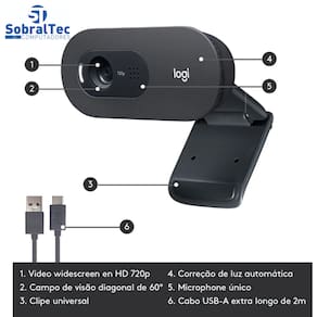 Ficha técnicaCódigo 2791842414Código de barras 0097855163554Fabricante LOGITECHVoltagem Não Se AplicaMarca LOGITECHAlimentação, tipo de bateria usbConexões USBCapacidade de Armazenamento NÃO SE APLICARequisitos do Sistema Windows® macOS 10.10 ou superior Chrome OS™ USB - A port Funciona com plataformas de chamadas popularesConteúdo da Embalagem Webcam com cabo USB-A de 2 metros anexado Documentação do usuárioGarantia do Fornecedor 24 MesesDimensões da embalagem - cm (AxLxP) 13,6 X 13,6 X 8,1Dimensões do produto - cm (AxLxP) 3,19 X 7,9 X 6,64Peso da embalagem c/ produto (kg) 0,184Peso liq. aproximado do produto (Kg) 0,075Referência do Modelo 960-001363Modelo c505SAC