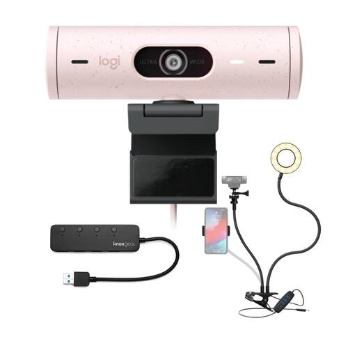 - O pacote inclui: webcam Logitech Brio 500 (rosa), hub USB 3.0 de 4 portas e suporte para selfie Ring Light com suporte intercambiável para celular e suporte para webcam/câmera - Controle ON/OFF de