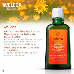 Óleo corporal para massagem. Ideal para quem pratica esportes, Weleda Óleo Corporal para Massagem de Arnica hidrata e aumenta a circulação sanguínea para aquecer e relaxar os músculos.
