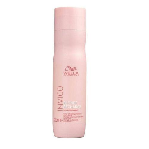 Invigo Blonde Recharge Color Refreshing Cool Blonde Shampoo com pigmentos. Renova e mantém o brilho e a vitalidade dos loiros naturais, coloridos ou com mechas. Este shampoo violeta evita que o cabelo loiro natural ou colorido fique amarelado e ajuda a eliminar o tom acobreado, deixando-o suave ao toque.