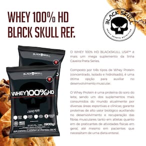 O Whey 100% HD Blackskull USA™ é mais um mega suplemento da linha Caveira Preta Series. Composto por três tipos de Whey Protein (concentrado, isolado e hidrolisado), é uma ótima opção para auxiliar no desenvolvimento muscular. Sua composição conta também com a adição de BCAA (leucina, isoleucina, valina) que são, aminoácidos de cadeia ramificada e contribuem para uma melhor recuperação pós-treino. O Whey Protein é uma proteína do soro do leite, sendo um dos suplementos mais consumidos do mundo atualmente por diversas áreas esportivas e clínicas; garante proteínas de alto valor biológico auxiliando no desenvolvimento e recuperação das fibras musculares tanto em atletas quanto em de praticantes de atividades físicas em geral, até mesmo em pacientes que necessitam de uma dieta enteral.