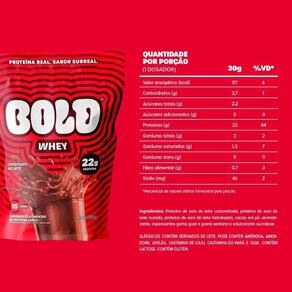 Bold Whey Protein Chocolate 900g - Proteína real, sabor surreal Mais rendimento, mais sabor, mais performance. O BOLD Whey Protein Chocolate 900g foi desenvolvido para quem não abre mão de praticidade e rendimento. São 22g de proteína por porção de 30g, fornecidas através de um blend de whey concentrado, isolado e hidrolisado de alta qualidade, com rápida absorção e ótima digestibilidade. Com sabor intenso e textura cremosa, é perfeito para incluir na rotina: do shake pós-treino às receitas caseiras mais elaboradas. A embalagem de 900g garante excelente custo-benefício para quem consome com frequência. Destaques do Produto - 22g de proteína por porção 30g - Sabor autêntico e marcante de chocolate - Blend de whey concentrado, isolado e hidrolisado - Textura cremosa e fácil de preparar - Embalagem de 900g com maior rendimento - Ideal para performance, e receitas variadas Ingredientes Proteína de soro do leite concentrada, proteína isolada do soro do leite, proteína hidrolisada do soro do leite, cacau em pó, aromatizantes, espessantes goma guar e goma xantana e edulcorante sucralose. Informações para Alérgicos Contém derivados de leite. Pode conter amêndoa, amendoim, avelãs, castanha-de-caju, castanha-do-pará e soja. Contém lactose. Contém glúten. Sugestão de Consumo Consumir até 2 porções ao dia, diluindo 30g em 200ml de água ou leite, ou conforme orientação . Modo de Armazenar Conservar em local fresco, seco e ao abrigo da luz. Após aberto, consumir em até 180 dias e manter a embalagem bem fechada.