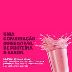 Bold Whey Protein Morango - 450g Proteína real, sabor surreal Uma explosão cremosa de sabor com 22g de proteína por dose O BOLD Whey Protein Morango foi desenvolvido para quem busca performance, praticidade e sabor marcante. Com textura suave, cremosa e o frescor irresistível do morango, ele transforma sua rotina em uma experiência saborosa e nutritiva. Perfeito para shakes, receitas ou até mesmo para preparar uma sobremesa rápida, o BOLD Whey Morango entrega nutrição e versatilidade em cada colher. São 22g de proteína por porção de 30g, com um blend de whey concentrado, isolado e hidrolisado, garantindo rápida absorção e alto valor biológico. Destaques do Produto - Sabor marcante e cremoso de morango - 22g de proteína por porção 30g - Blend de proteínas: concentrada, isolada e hidrolisada do soro do leite - Versátil: ideal para shakes, receitas e sobremesas - Textura leve e fácil diluição - Qualidade BOLD: nutrição e sabor em equilíbrio Ingredientes Proteína de soro do leite concentrada, proteína isolada do soro do leite, proteína hidrolisada do soro do leite, morango desidratado, aromatizantes, corante carmim, acidulante ácido cítrico, espessantes goma guar e goma xantana e edulcorante sucralose. Informações para Alérgicos Contém derivados de leite. Pode conter amêndoa, amendoim, avelãs, castanha-de-caju, castanha-do-pará e soja. Contém lactose. Contém glúten. Sugestão de Consumo Adultos 19 anos : consumir até 2 porções ao dia, diluindo 30g em 200ml de água ou leite, ou conforme recomendação de de saúde. Modo de Armazenar Conservar em local fresco, seco e ao abrigo da luz. Após aberto, consumir em até 180 dias e manter a embalagem bem fechada.
