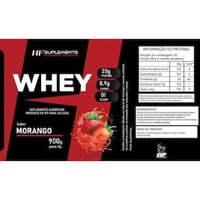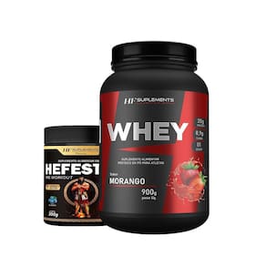 Whey protein 900g - sabor morango Com uma coleção de proteína completas para suplementar seu organismo, o whey protein da linha premium da hf suplements é ideal para você atingir a sua meta diária de proteínas, fazendo com que o ganho de massa muscular seja facilitado. Com o whey protein da hf suplements, você consome por dose:- 20g de proteína por scoop.Seus treinos tem um novo parceiroIngredientes: Sabor morango - proteína do soro do leite concentrada, proteína de soja isolada, proteína de trigo, proteína de soro do leite isolada, agente espessante goma xantana, edulcorantes sucralose e acessulfame potássico e aromatizante idêntico ao natural de morango e corante vermelho bordeaux.Contém glúten. Contém lactose.---------------------------------------------------------------------------------------------------------------------Hefestus pré treino blueberryPossui uma combinação perfeita de ingredientes que auxiliam no fornecimento de energia, vasodilatação, foco e aumento de força para obter uma maior performance nos treinos. Sugestão de uso: diluir 3 três medidas do dosador interno ou equivalente a 15g do produto em 200ml de água e ingerir preferencialmente uma hora antes do treino ou atividade física.--------------------------------------------------------------------------------------------------------------------- Através deste anúncio você está adquirindo 1 um pote de whey protein de 900g hf suplements sabor morango + 1 um pré treino hefestus de 300g sabor blueberry.