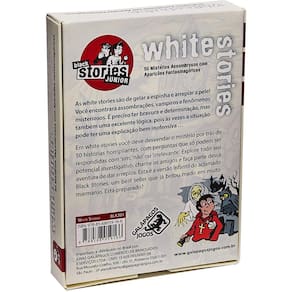 As white stories são de gelar a espinha e arrepiar a pele!Você encontrará assombrações, vampiros e fenômenos misteriosos. É preciso ter bravura e determinação, mastambém uma excelente lógica, pois às vezes a situação pode ter uma explicação bem inofensiva …Em white stories você deve desvendar o mistério por trás de 50 histórias horripilantes, com perguntas que só podem serrespondidas com ‘sim’, ‘não’ ou ‘irrelevante’. Explore todo seu potencial investigativo, chame os amigos e faça parte dessaaventura de dar arrepios. Esta é a versão infantil do aclamado Black Stories, um best seller que já botou medo em muito marmanjo. Está preparado?