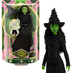 Cante junto com Elphaba! Inspirada no filme Wicked, da Universal Pictures, a fashion doll Elphaba cantora captura a essência da força e da superação das adversidades. Pressione o botão para ouvir trechos da icônica canção "Defying Gravity". A estudante da Shiz University veste um suave vestido preto removível, complementado por seu característico chapéu pontudo e sapatos de salto grosso. Com cabelo longo e trançado e pele verde, ela exibe o visual marcante inspirado no filme. A boneca Elphaba é um presente musical perfeito para os fãs do musical, que vão adorar cantar junto. As bonecas não se mantêm em pé sozinhas. As cores e decorações podem variar.