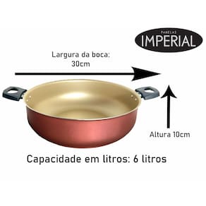 Descrição: Diâmetro: 30,0 cm. Largura Total: 45 cm (alça/alça) Largura: 30 cm Altura: 10 cm Peso Frigideira: 0,600g Peso com Tampa: 1,415 kg Capacidade Volumétrica: 6 litros Espessura 1,7 mm