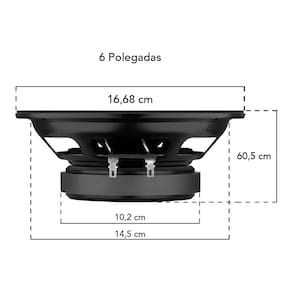 Informações técnicas: • Potência RMS: 250W • Potência de Programa Musical: 500W • Impedância Nominal: 4 Ohms • Sensibilidade(@ 1W, 1m)-Free-Air: 92,277dB • Densidade do fluxo no gap: 10.100 GAUSS • Resposta de frequência: 48Hz a 5.000Hz • Material do fio da bobina: Cobre • Forma da bobina: Fibra • Material do ferrite: Bário • Massa diafragma (mmd): 45,973g • Diâmetro da bobina: 50,8mm • Frequência de ressonância: 58,3Hz • Área efetiva do cone (sd): 51,071 Sq.m • Diâmetro nominal: 12 Polegadas • Peso: 3,4Kg