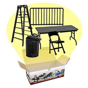 Vem com os seguintes itens: (1 mesa quebrável, 1 escada, 1 cadeira dobrável, 1 trilho de controle de multidões e 1 lixeira com tampa)