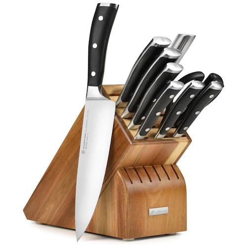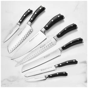 Aço inoxidável resistente a manchas de alto teor de carbono, totalmente forjado e com reforço reduzido, a Tecnologia Precision Edge PEtec produz uma lâmina 20 mais afiada com o dobro da retenção da borda. 58 Dureza Rockwell O ângulo da lâmina de 14 em cada lado oferece nitidez superior. Alça sintética preta com rebites triplos contornos projetada para conforto e controle. Fabricado em Solingen Marca: Não Informado