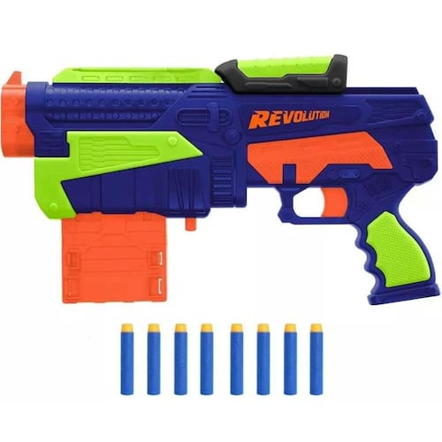 O Revolution é um super e robusto lançador de 30cm de comprimento, possui alcance de 25 metros e um clipe para armazenar os dardos e dispará-los de maneira rápida e precisa! Proporciona precisão nos lançamentos juntamente com design confortável e 8 dardos de longa distância inclusos para brincar.