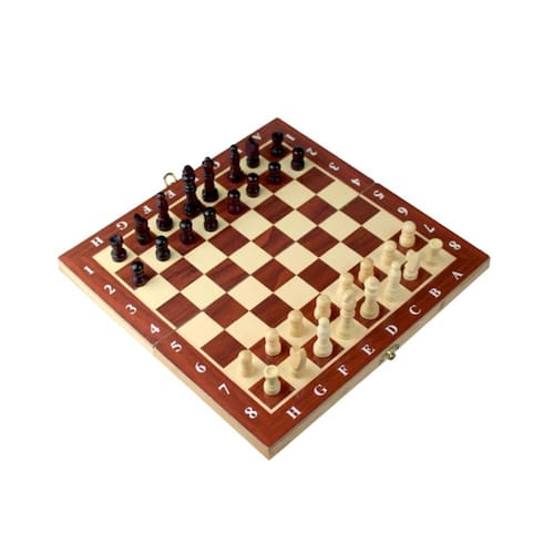 O tabuleiro é dobrável e guarda todas as peças quando não em uso.