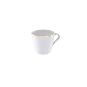 Fabricado em Porcelana. Acabamento em fio dourado. Cuidados: Não vai à lava-louças e ao micro-ondas. Coleção: Elisa. Porosidade próxima de zero, evitando a proliferação de fungos e bactérias. Volume da xícara: 185 ml.
