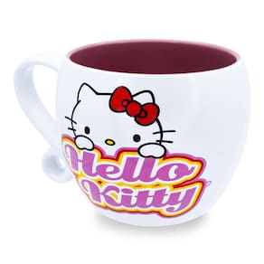 - Nada além de amor: Hello Kitty está espiando por trás de seu nome nesta encantadora caneca de café branca com um interior rosa macio. Decorada em rosa, vermelho e amarelo para uma paleta colorida e possui uma alça estilizada para um toque extra.