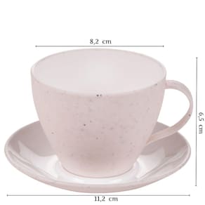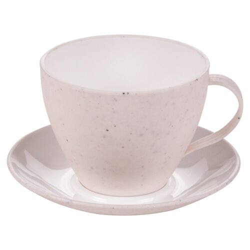 Xícara de plástico com pires para servir café e chá, com decoração predominantemente branca com leves traços/ranhuras pretas por toda a peça, que traz uma aparência marmorizada super requintada ao produto.