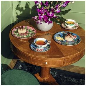 Este é um Conjunto de Xícara e Pires de Lótus Rosa da coleção Wonderlust da Wedgwood. Feito de porcelana fina nas cores rosa e verde, com detalhes dourados, este conjunto simboliza a sabedoria interior e a sacralidade da vida cotidiana.