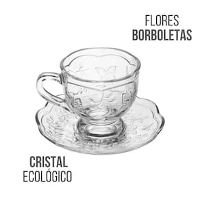 Xícara de Chá Café com Pires Cristal Ecológico New Butterfly Flores Borboletas 180ml Lyor