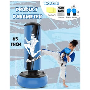 Marca: YORWHIN? Fabricante: ORWHIN? Modelo: Punching Bag-blue (O52S0104GD-Blue)? Tipo de produto: Saco de pancadas inflável infantil em pé? Tamanho nominal: 66"? Esportes indicados: Boxe, kickboxing, taekwondo? Cor: Azul? Tema/time associado: MMA? Liga (descrição do anúncio): MMA? Faixa etária recomendada: Juvenil (youth), aproximadamente 3 a 14 anos? Material predominante: Policloreto de vinila (PVC)? Estrutura de câmaras de ar: 3 câmaras independentes? Altura aproximada do produto: 168 cm? Diâmetro aproximado da base: 58 cm Dimensões do item (comprimento x largura x altura): 19 cm x 19 cm x 10 cm Dimensões da embalagem (comprimento x largura x altura): 23,2 cm x 16,5 cm x 15,5 cm? Peso do produto: 1,13 kg Peso do pacote (produto + embalagem): 1,20 kg? Base: Compartimento inferior para preenchimento com água ou areia? Recursos adicionais: Alças laterais para movimentação? Estilo: Fighting Style 01? Itens inclusos na embalagem: 1 saco de pancadas inflável, 1 par de luvas de boxe? Manual do usuário: Manual em inglês? Marca: Não Informado