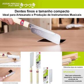 O Serrote Japones Dozuki Panel Piercing P150 P1.41 é um serrote compacto e de dentes finos. Esta versão é ideal para ser utilizada na restauração de móveis, trabalhos precisos sobre laminado, madeira maciça ou produção de instrumentos musicais. Este serrote é denominado piercing pois é capaz de começar um corte a partir do meio da peça, graças ao dente especial no inicio da lâmina. Todos os dentes da linha Z-Saw são endurecidos através do Hard Impulse, tratamento que eleva o grau de dureza do aço ao nível HV800-950 64.0 - 68.2 HRC , que é a dureza máxima que o aço pode alcançar, o que confere ao serrote um excelente desempenho de corte. O cabo em madeira envolto em ratan. Especificações: Comprimento do cabo: 190 mm, Comprimento: 150 mm, Comprimento Total: Aproximadamente 375mm, Pitch entre dentes : 1,41 mm, Espessura: 0,30 mm, Kerf espessura de corte : 0,49mm. Tratamento de superfície: Cobertura de óleo; Lâmina de reposição: ref. 7102. Origem : Japão Marca: Zet-Saw Marca: Não Informado