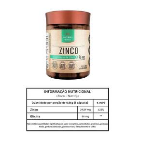 Descrição: O zinco é um mineral envolvido em inúmeras reações enzimáticas e metabólicas e por isso seu consumo é tão importante. Zinco nutrify apresenta-se em cápsulas, na forma de bisglicinato, uma fonte altamente absorvível do zinco 96 mg de bisglicinato de zinco fornecem 29,59 mg de zinco . Com matéria-prima vegana e cápsulas vegetais, sendo perfeito também para quem não consome ingredientes de origem animal.
