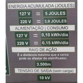 Informações Técnicas Alimentação: 127/220V Automático Raio de ação: 3.500 metros Energia Acumulada: 127V 5,00 Joules 220V 3,20 Joules Energia Liberada: 127V 3,80 Joules 220V: 3,20 Joules Consumo de energia elétrica: 127V: 0,098kwh/dia 220V: 0,151kwh/dia Tensão de saída sem carga: 10 kV Intervalo entre pulsos regulável: 1,05 a 2,1 segundos
